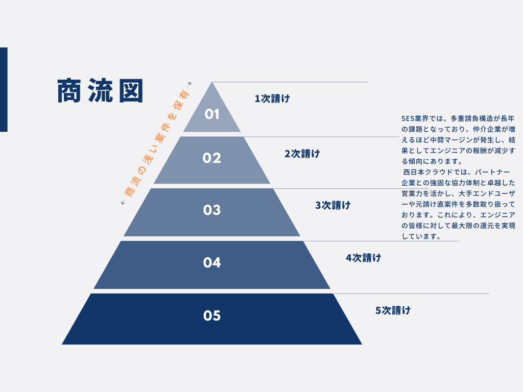 首都圏は企業数・案件数ともに多く、さらに高単価な案件も豊富に存在しています。西日本クラウドは、首都圏と地方における「収入格差」「情報格差」を解消するため、西日本にいながら首都圏の案件に参画できる環境を整備しています。